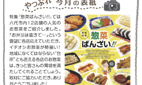 特集「惣菜ばんざい!!」では八代市内12店舗の人気のお惣菜をご紹介しました。「お弁当は抜きで…」という要望に各店応えていただき、イチオシお惣菜が勢揃い!地域になくてはならない“台所”とも言える各店のお惣菜は、きっと皆さんの胃袋を満たしてくれることでしょう。取材にご協力いただき、あ…