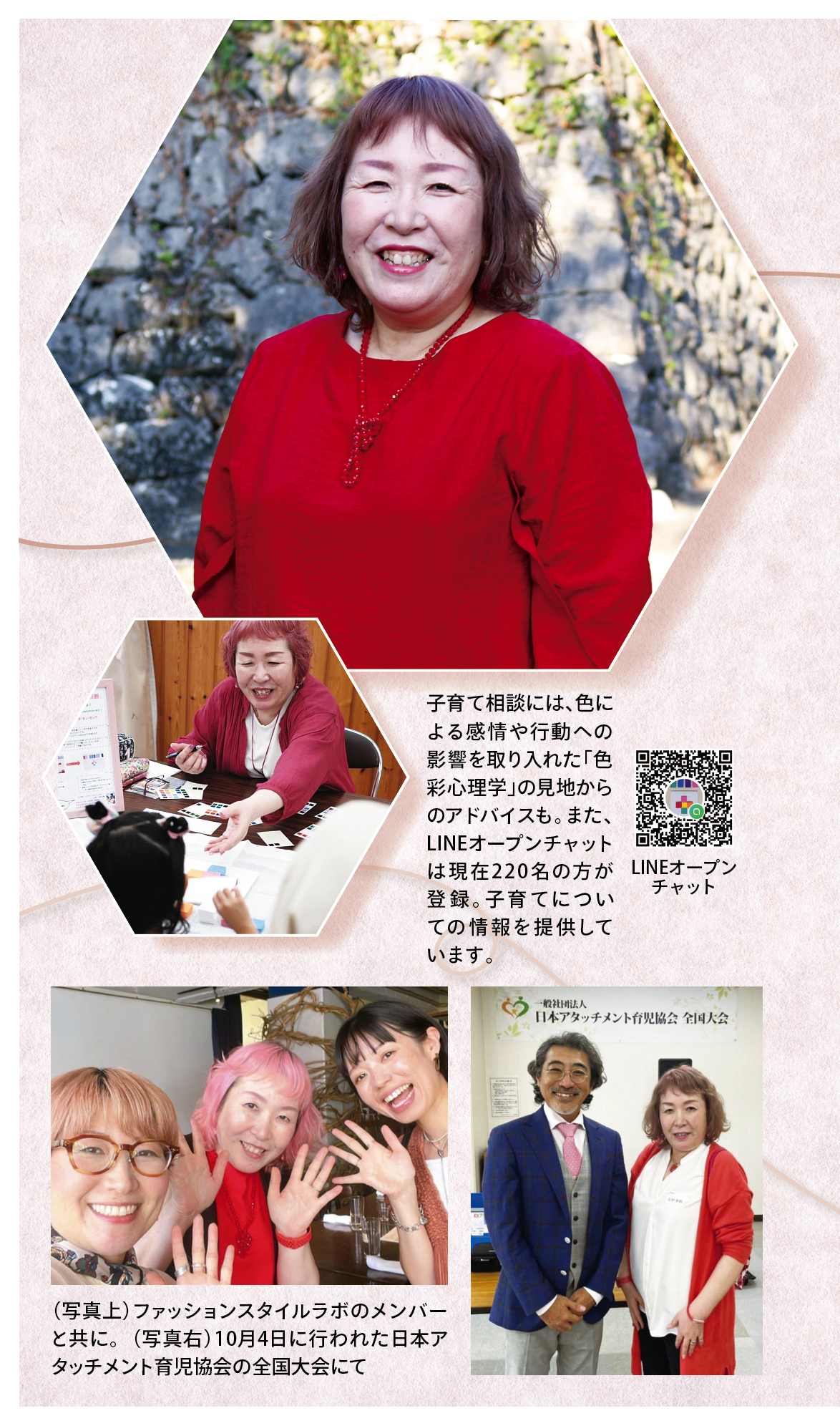 「子育てに必要なのは“濃縮ジュース”」と強調する吉野さん。1日3分でいいからしっかり子どもの目を見て会話をすること。他人と比べない。ご飯とみそ汁といった日本古来の食事を見直すーといったことの大切さを、ママたちに伝え続けています。さらに“色彩”から人の心を探求する色彩心理学の学びを、子育てや家族関係に悩むママたちに伝える相談会なども実施しています。
