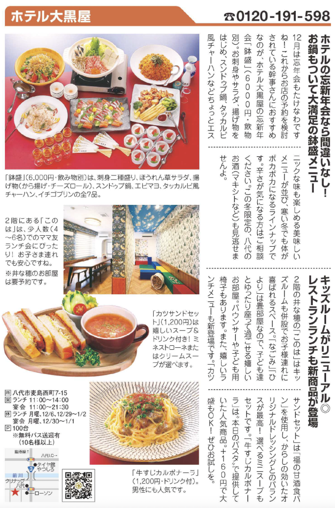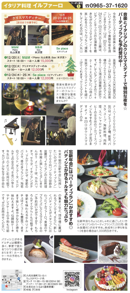 2025年12月号2025.11.30 2025.12.01 8pre-admin やつしろグルメ ツイート シェア はてブ LINE Pocket イタリア料理 イルファーロ 熊本チャイニーズ 焼肉ホルモン くたみや 八代本店 うなぎ処 鰻新 コメダ珈琲店 ゆめタウン八代店 焼鳥屋とりしん ホテル大黒屋 KUIDOKORO 秀KITCHEN Sawada Coffee Roasters 居酒 金之助 八代店 ツイート シェア はてブ LINE Pocket feedly