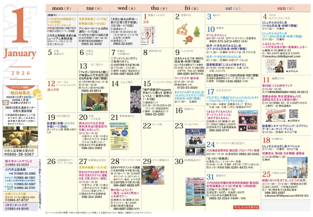 ※イベントが多いため、「桜十字ホールやつしろ」「八代市立図書館(本館・せんちょう・かがみ)、子羊文庫」「お祭りでんでん館」「くまモンポート八代」については色分けで表示しております。