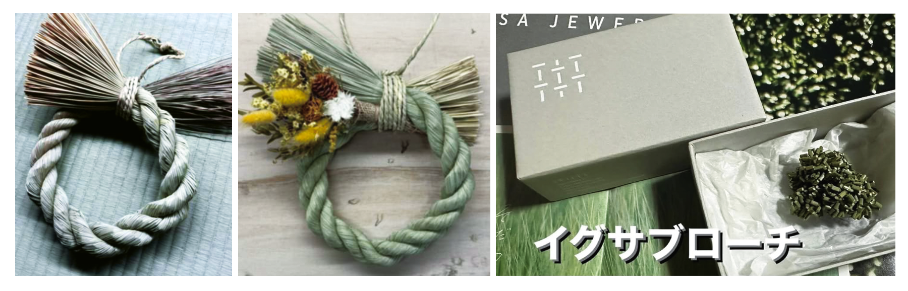 (写真左・中央)い草のしめ縄やリース作りは、今後フラワーショップとのコラボも。