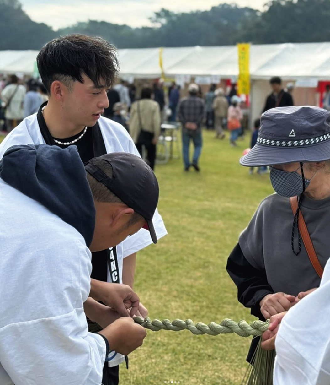 (写真右)2024年11月に開催された『くまもと農業フェア』にて、来場者と一緒にい草のしめ縄作り。