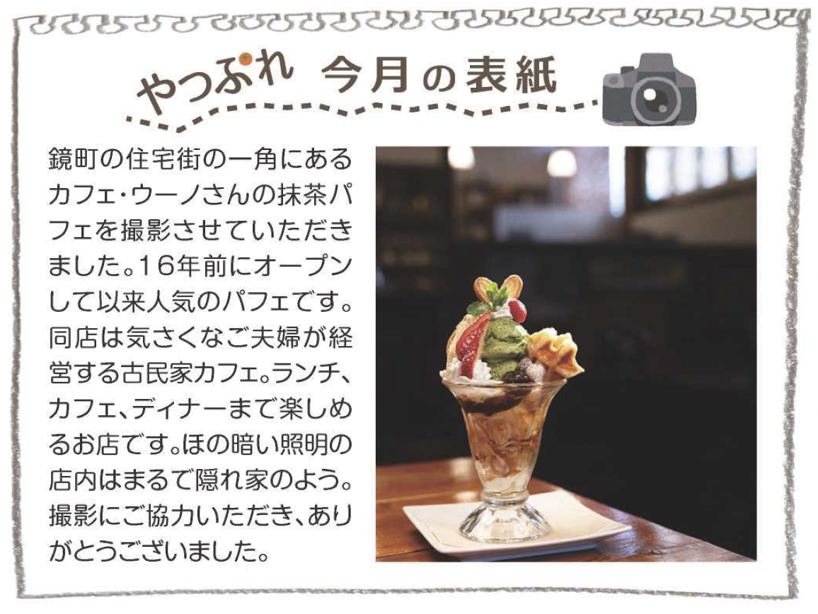 鏡町の住宅街の一角にあるカフェ・ウーノさんの抹茶パフェを撮影させていただきました。16年前にオープンして以来人気のパフェです。同店は気さくなご夫婦が経営する古民家カフェ。ランチ、カフェ、ディナーまで楽しめるお店です。ほの暗い照明の店内はまるで隠れ家のよう。撮影にご協力いただき、ありがとうございました。